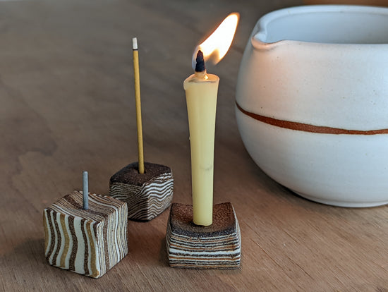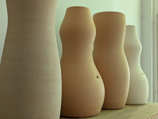 I work with a spectrum of different clay bodies, including light and dark stoneware and porcelain clays.