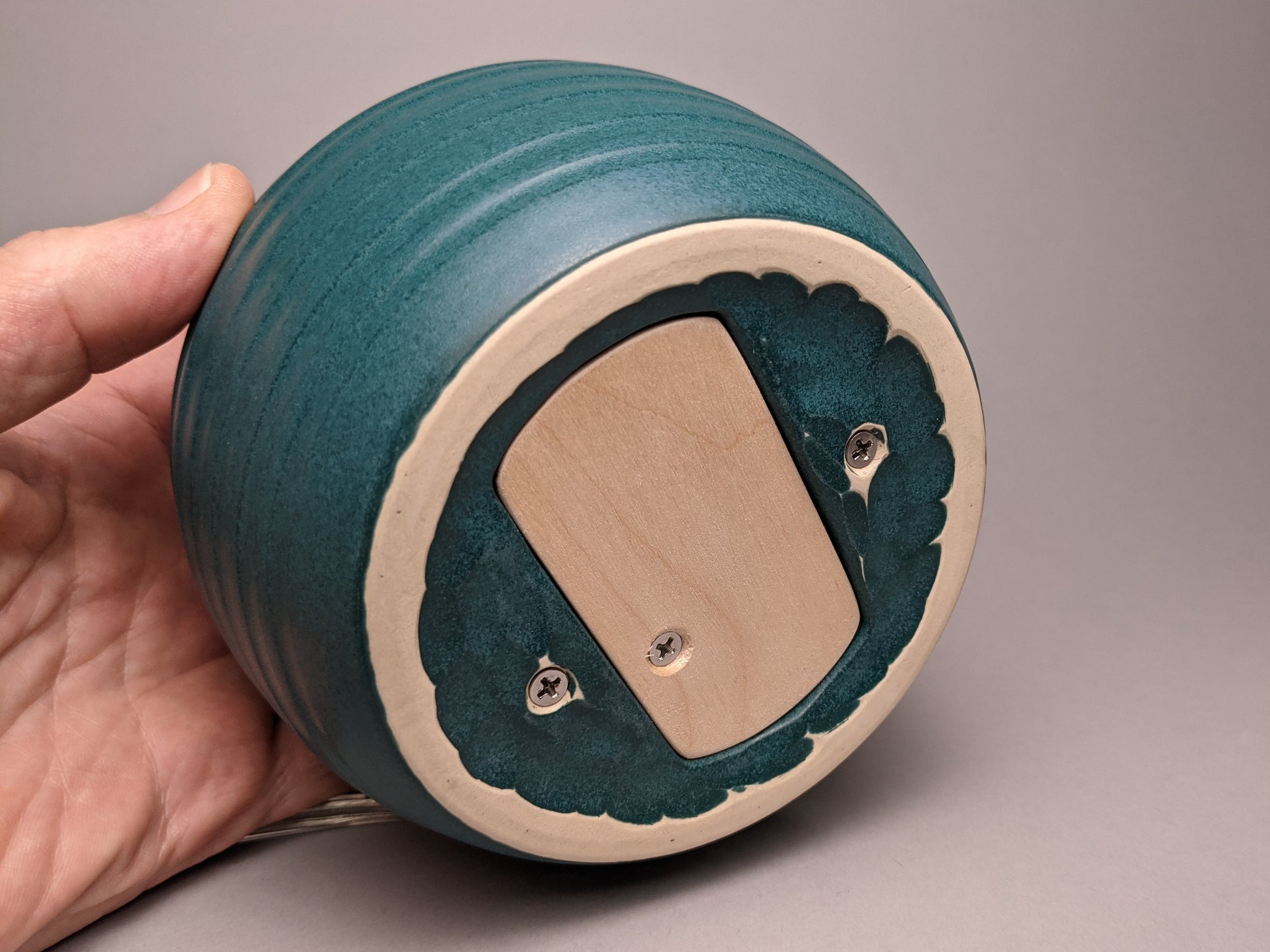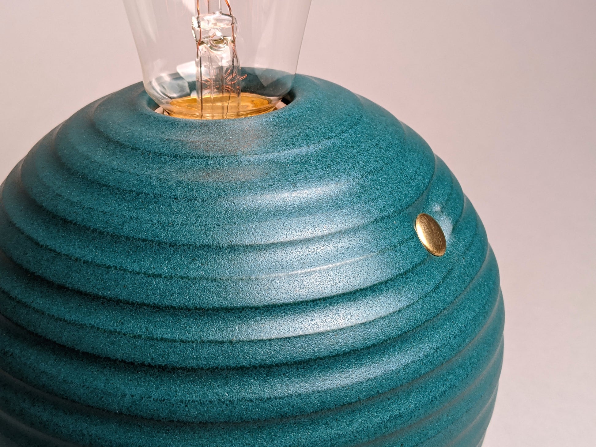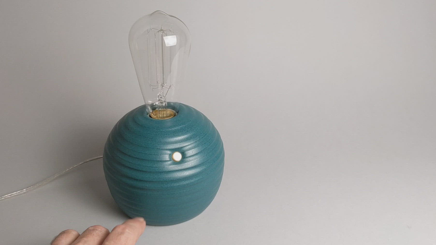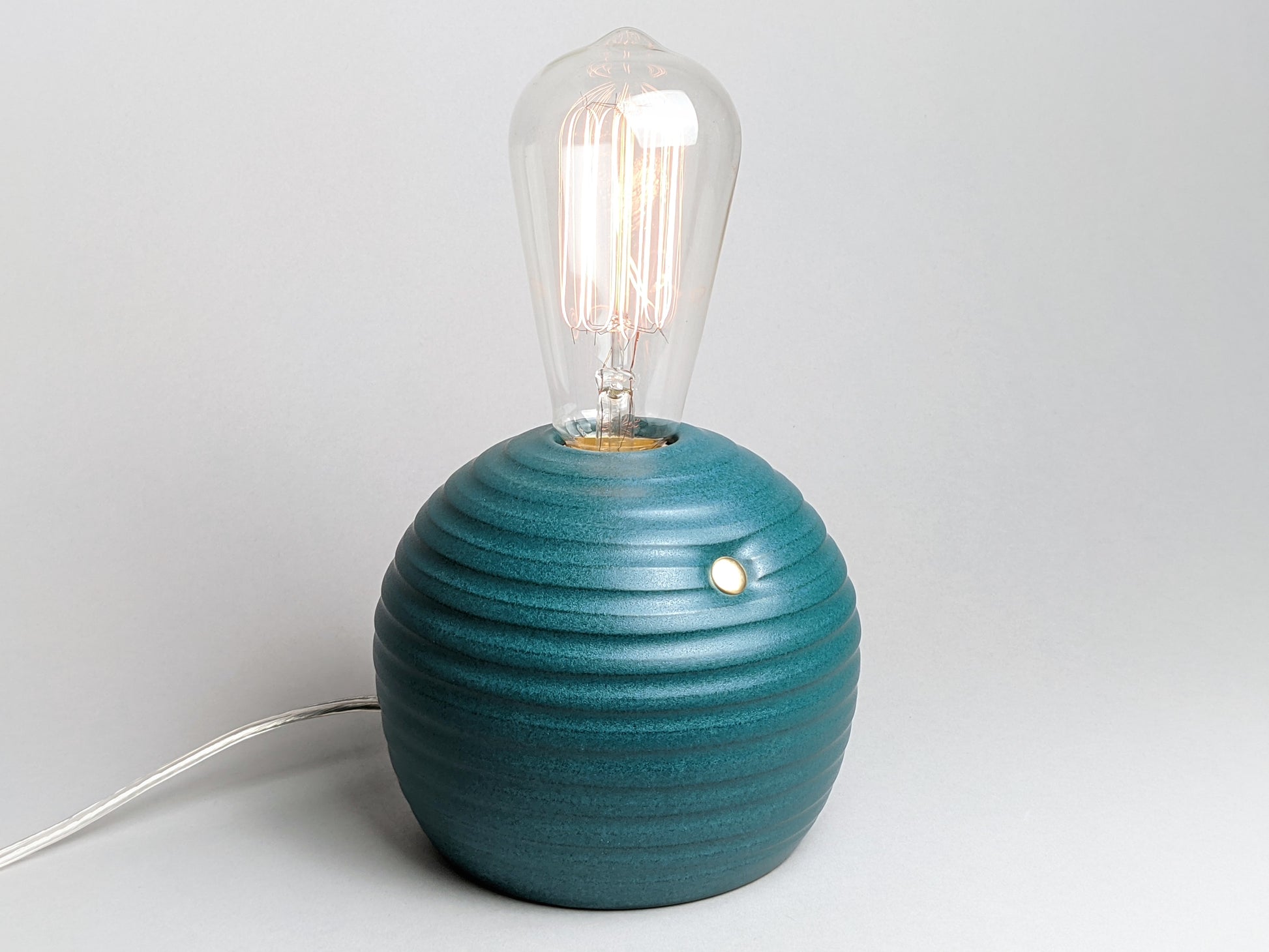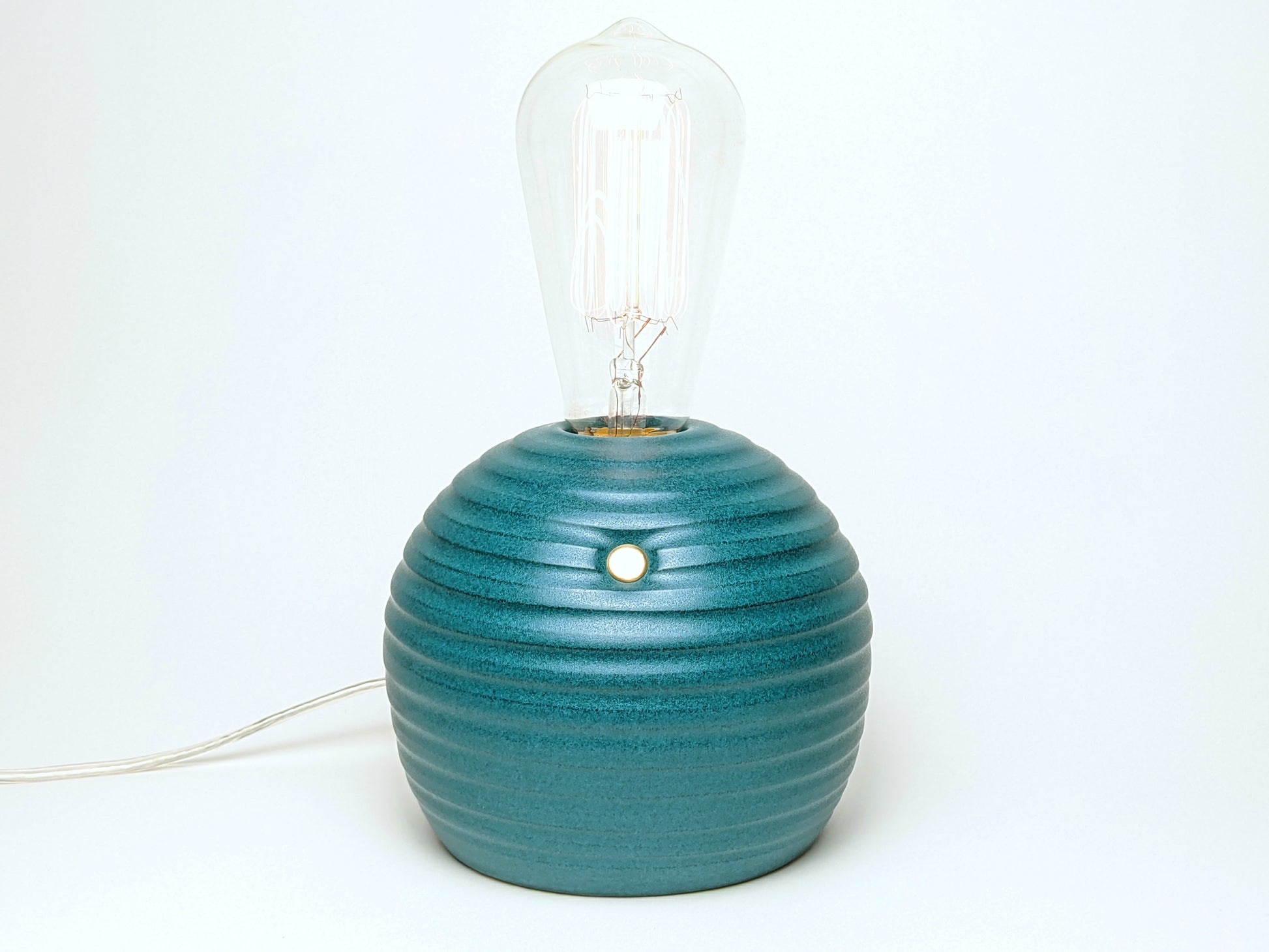 This striking, one of a kind lamp was wheel thrown in my Austin studio with a smooth, bright stoneware clay and is glazed with a satin teal green glaze. This lovely satin glaze highlights the subtle spiral texture featured on this lamp. Spherical shape with slightly recessed brass sensor is attractive and pleasing to touch. About 4" tall and 5" wide.